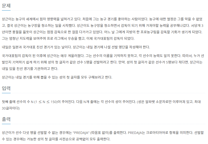 입력을 받은 성의 첫 글자를 딕셔너리의 키로 정하고, 해당 글자의 개수를 세어준다. 5글자가 넘으면 저장하여, 저장된 문자가 있으면 문자들을 출력하고, 없으면 'PREDAJA'를 출력한다.