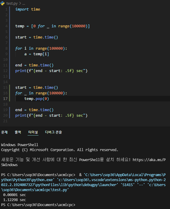 100,000개를 단순히 탐색이랑 pop(0)으로 테스트 해봤다.